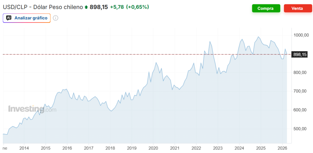 El peso chileno cerró la semana con una fuerte baja en línea con el optimismo que se apoderó de los mercados globales por la tregua de 2 semanas en la guerra en Medio Oriente, un cese al fuego que provocó un descenso de la divisa frente a otras monedas y una caída en los precios referenciales del petróleo por debajo de la marca de US$ 100 por barril. El dólar cotiza hoy a $898.