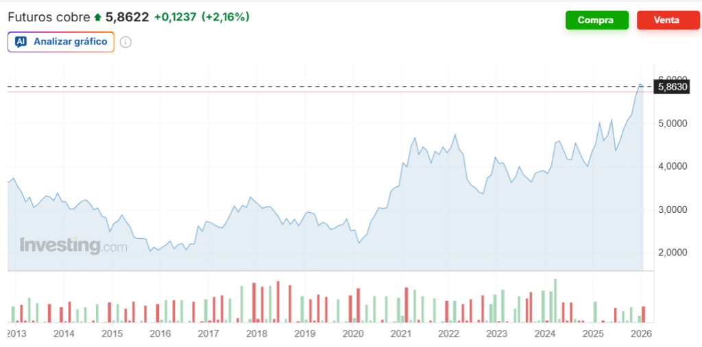 En paralelo, el cobre intenta estabilizarse tras caídas previas, aunque enfrenta presión por el aumento sostenido de inventarios en bodegas monitoreadas por bolsas internacionales, que alcanzan máximos de casi un año.
