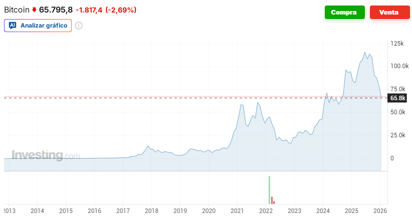 Bitcoin se desploma hacia los U$65.000 mientras temores sobre la IA sacuden los mercados
